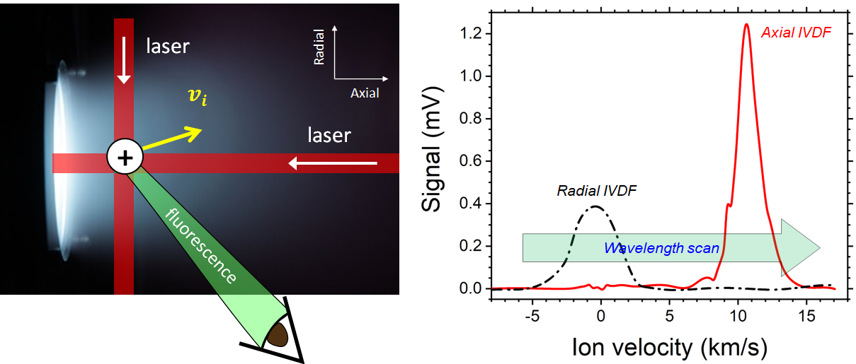 LIF spectroscopy는 타겟 입자 속도 벡터에서 레이저의 진행방향에 평행한 속도성분을 추출해낸다는 엄청난 강점을 갖는다. Figure 3의 왼쪽 그림과 같이 레이저를 두 방향에서 쏘아서 한 점에 모아준 뒤 이 점에서의 fluorescence를 측정하면 교차점에 존재하는 타겟 입자가 갖는 속도 성분 2개를 한꺼번에 얻어낼 수 있다. Figure 3의 오른쪽 그림은 그러한 방법을 통해 홀추력기 플라즈마에서 측정한 Xe+이온의 축방향 & 반경방향 속도분포로, Xe+ 이온의 수많은 전자의 에너지 state 중 $\lambda_{\rm{exc}}$ = 834.723 nm 인 state를 이용한 것이다.