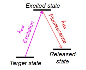 원자에 속한 전자는 양자화된 에너지 state 상에 존재한다. (화학2에 나오는 $n$, $l$, $m$과 관련) 전자는 에너지를 얻고 잃음에 따라 다른 에너지 state로 전이될 수 있는데, 전이된 state가 안정적으로 머무를 수 있는 state라면 그곳에 안주해 머무르지만, 불안정적인 state라면 에너지를 내놓고 안정적인 state로 내려간다. 이렇게 전자가 높은 에너지로 올라가는 것을 excitation(여기), 전자가 excited state에서 에너지가 낮은 state로 이동하며 그에 해당하는 빛을 내놓는 것을 fluorescence(형광)라 한다.