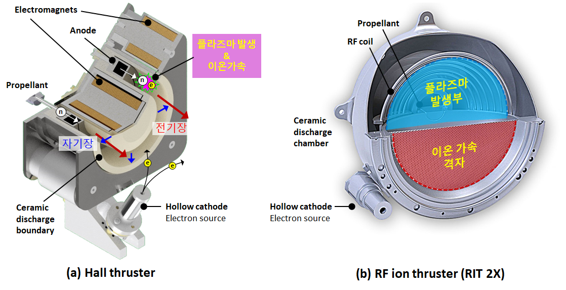 Electrostatic type 전기추력기의 대표주자인 홀추력기와 이온추력기는 전압강하를 통해 이온을 가속시킨다는 원리만 같을 뿐 구동 원리가 전혀 다르다. Figure 4는 두 전기추력기의 간이 단면을 나타낸 그림으로, 서로 매우 다를 것임을 시각적으로도 알아챌 수 있다.