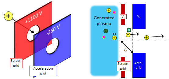 Free space에서 이온을 가속시키는 홀추력기와 달리, 이온추력기는 Fig. 5와 같이 격자형의 두 전극을 통과하는 이온을 가속시킨다. 전극 사이를 통과하는 전하의 전류밀도 상한을 Child-Langmuir Law 라 하는데, 이온추력기에서는 이온전류밀도 $J_i$의 상한을 Child-Langmuir Law를 통해 추정할 수 있다. 이온전류밀도의 상한은 이온분출량에 제한이 있음을 의미하므로, 이는 곧 이온추력기가 홀추력기와 동일한 추력을 발생시키기 위해서는 보다 넓은 분출면적이 필요함을 의미한다.