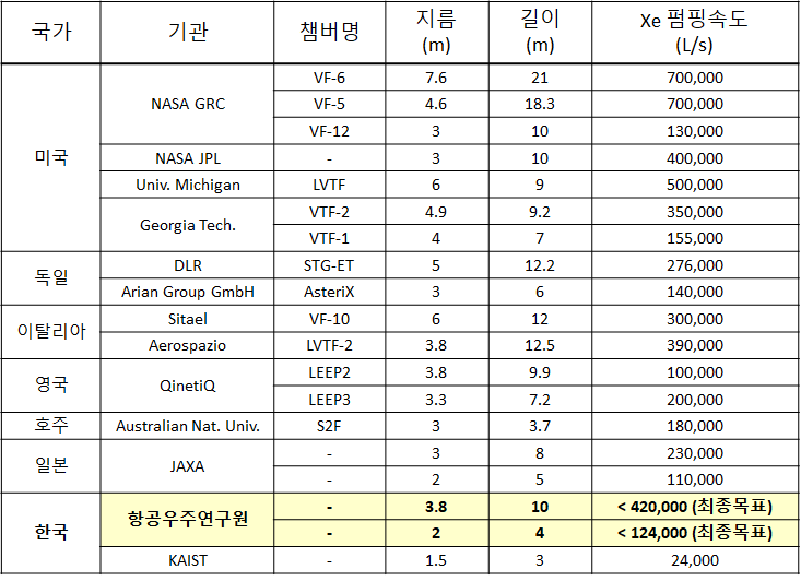 우리나라에서는 기초연구 또는 1 kW 이하의 소형 전기추력기를 중심으로 전기추력기가 개발돼왔으나, 항공우주연구원에서는 2021년 전기추력기 시험시설 구축사업을 개시하여 지름 3.8 m, 길이 10 m의 대형 진공챔버 기반의 시험시설 구축을 완료하여 2024년 준공식을 마치고 운용중에 있다. 초기 운용 단계에서는 고진공 펌프가 일부만 설치되어 약 60,000 L/s의 Xe 펌핑속도로 사용되고 있으며, 최종적으로는 420,000 L의 펌핑속도를 달성하고자 힘쓰고 있다.