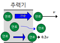 - 즉, 90%의 이온은 24.3 km/s, 이온화가 되지 못한 연료는 약 0.15 km/s로 분출된다. 이 경우 연료의 평균분출 속도는 21.8 km/s가 된다.